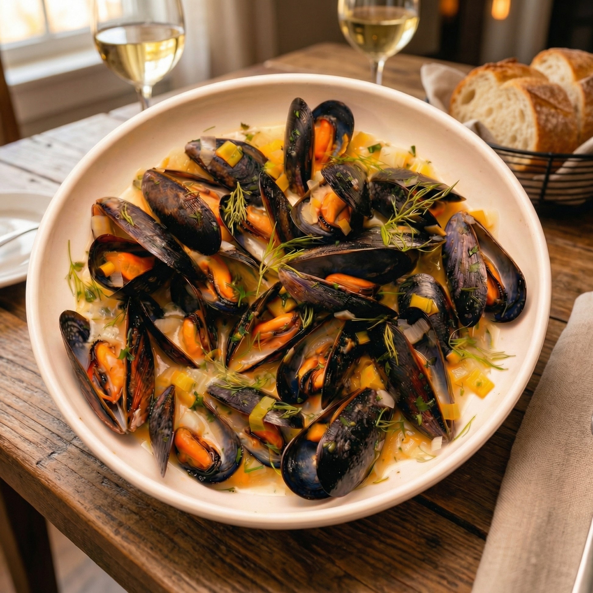 Rope-cultured blue mussels, cleaned and frozen on the half shell to lock in freshness. Tender meat with a clean, ocean-forward flavor and minimal sand content.